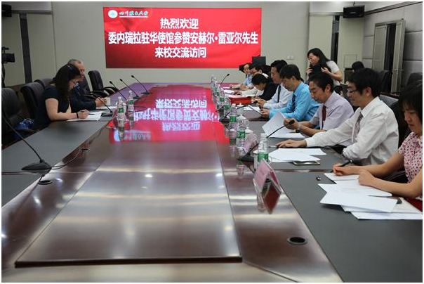 5月11日,委内瑞拉驻华大使馆参赞安赫尔•雷亚尔先生来校推动国际交流合作并举行赠书仪式。副校长王曙光,国际交流合处、图书馆、动医院、管理学院、资源学院、环境学院、经济学院负责人参加座谈会。国合处处长张小平主持会议。