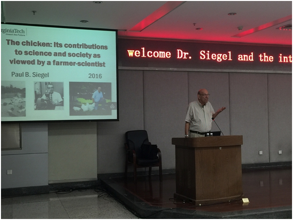 9月12日上午,在图书馆报告厅举行了Paul B. Siegel教授和我校家禽方向学术报告会,动科院、动医院、营养所共200余名师生参加了报告会。副校长朱庆教授致欢迎辞,并向外国学生赠送了校庆纪念章。Paul B. Siegel教授作了题为《一位农夫科学家看家鸡对科学和社会的贡献》的报告,讲述了鸡的发展情况及研究进展,提出今后可从微生物、抗病性、基因组等多个方面进行深入研究。动物营养研究所张克英教授、预防兽医研究所陈舜副研究员、动物遗传育种研究所韩春春副研究员和赵小玲教授分别从营养、禽病、育种研究等方面作了报告。