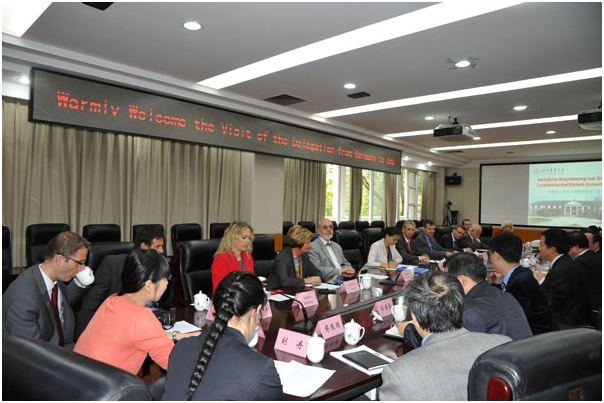 邓良基对贵宾的到来表示热烈欢迎,他用流利的德语向对方介绍了学校在教学、科研、社会服务、国际交流与合作的基本情况,其中重点介绍了与德国的合作情况。他谈到,1985年以来,学校赴德国留学、研修、学术交流的教师共计53人,其中7人获得博士学位,回校教师在学校教学、科研及管理岗位上发挥了重要作用。2008年以来,中国国家留学基金委资助,学校共派出26名研究生赴德国攻读博士学位或联合培养。2006年,德国驻成都总领事郭思茂及夫人访问学校。2009年,我校与波恩大学、南威斯特法伦应用技术大学开展“青年学生文化和学术交流summer school”活动。2010年2月,学校与波恩大学签署校际合作协议。2011年11月,学校与南威斯特法伦应用科技大学签署校际交流合作协议。自上世纪80年代末期以来,德国专家及政府领导访问学校共计132人次,开展了卓有成交的学术交流与合作。目前,我校与德国在科技方面合作的重点项目有以下5项:中德沼气能源利用的比较研究;建立提高能源系统途径的支持农村生计模型,减少温室气体排放和森林资源压力;四川农业大学—德国北威州农发部“动物福利”合作研究项目;四川农业大学—德国波恩大学农业学院“扬子江—莱茵河谷联盟—致力于食品安全和人类健康的农业可持续发展联合创新项目”;四川农业大学—亚琛工业大学中德水研究中心“农业生产中水资源管理方案的研究”。邓良基期待在接下来的日子里,能与德国展开更加密切的学术交流与合作。
