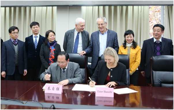 秦自强和爱斯提•比安奇分别代表双方签署了合作协议并互赠礼品。