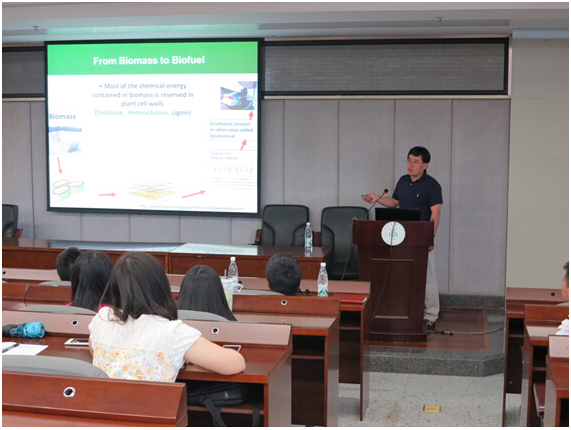赵炳宇在成都校区1教309会议报告厅作了题为:“Genetic Improvement of Switchgrass for Biofuel Production”(柳枝稷生物质能源生产的遗传改良)的报告。他分别从柳枝稷抗旱性评估,利用转录组探究抗旱分子机制,与抗旱相关转录因子的转基因研究三个方面就在抗旱方面提高柳枝稷生物质能源生产的遗传改良做了详细的报告,并简要介绍了其团队最新的研究进展,为柳枝稷遗传改良提供了重要的思路和方法。赵炳宇的精彩报告引起了在座师生对能源植物柳枝稷的浓厚兴趣。