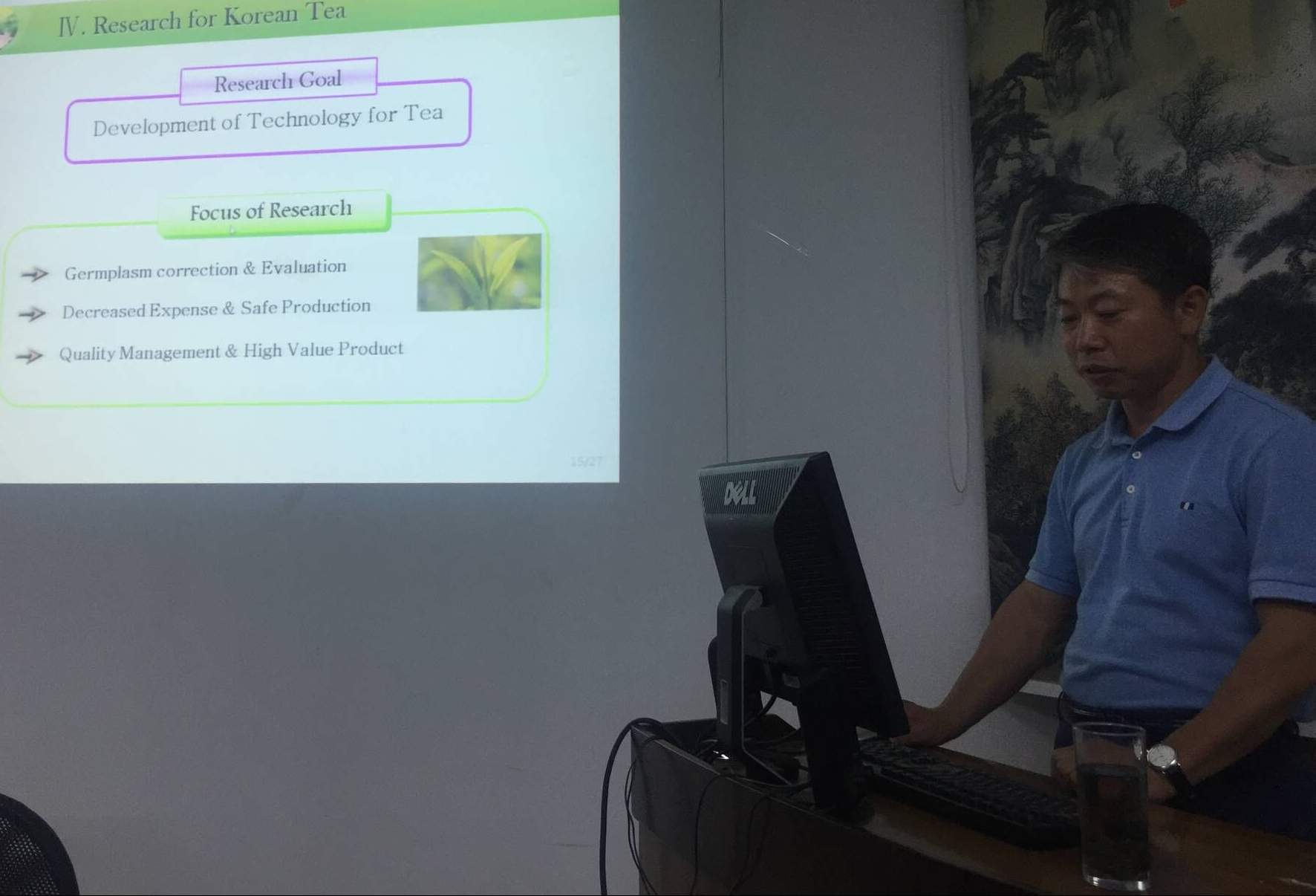 25日,园艺学院副院长唐茜教授和茶学系谭礼强博士陪同来访人员考察了我校与名山良种场共建的茶树新品种选育与示范基地,并参观了峨眉山竹叶青茶叶有限公司及其名优绿茶生产车间。26日下午,在成都校区5教108会议室,Moon Doo-GYung教授分别做了题为《Introduction to Research Institute of Climate Change and Agriculture》(气候变化与农业研究所介绍)和《Analysis for Korean Tea Industry》(韩国茶产业分析)两个学术报告。其中第一个报告主要介绍了该研究所的发展历程和近几年重要的研究成果,阐述了全球气候变暖对韩国当前及未来几十年的气温、降雨和四季更替带来的改变,并讨论了上述改变将对韩国主要园艺作物,如蔬菜、果树和茶叶的分布和管理方式的影响。第二个报告重点介绍了韩国茶产业的发展历史和现状、品种资源和栽培范围、以及经营和消费情况等;论述了韩国茶叶面临的主要问题(包括产量低、人工成本高、机械化难度大以及冬季冻害较为严重等)以及他们的研究目标。我校茶学教师、研究生和留校的部分本科生聆听了上述报告,并就气候变化与茶树栽培管理、病虫危害以及新品种选育等问题展开了交流。