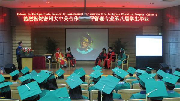 5月23日上午,中美草坪合作办学项目第八届学生毕业典礼在北京林业大学举行。美国密西根州立大学农业与自然资源学院负责人,四川农业大学、北京林业大学、苏州农业职业技术学院校领导及相关负责人参会。 我校副厅级调研员何临春、国际交流合作处副处长夏新蓉、该项目教学联络员孙飞达参加了毕业典礼。