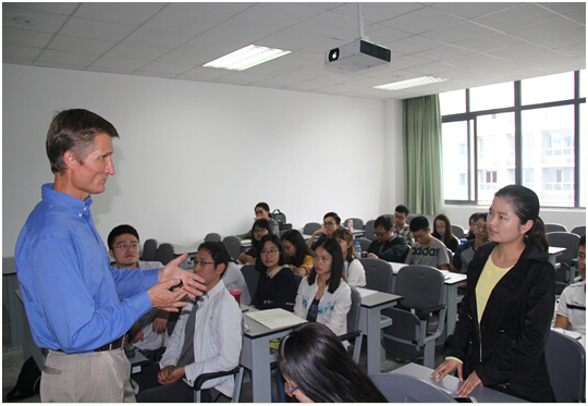 在关于“美国免耕农业生产系统”的报告中,Duiker博士分别从免耕对于土壤基本理化性质、土壤结构、耕作层质量、土壤侵蚀、微生物分布与活性以及对于作物产量等方面的综合影响和作用机制做了详细的报告,并对其最新研究进展做了简要介绍,为土壤管理和作物栽培研究提供了新的思路。同时,在“美国覆被耕作制度”的报告中,他结合覆被耕作推广计划在美国的发展、制度设计以及农民推广方案等问题为师生做了精彩报告。提问环节中,他详细回答了各专业师生的提问。
