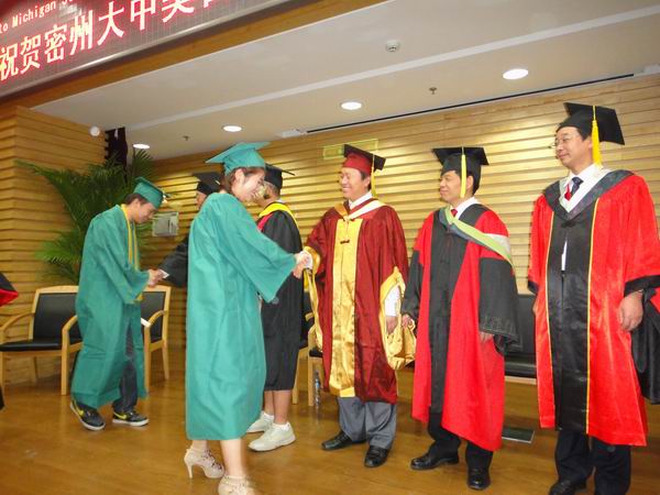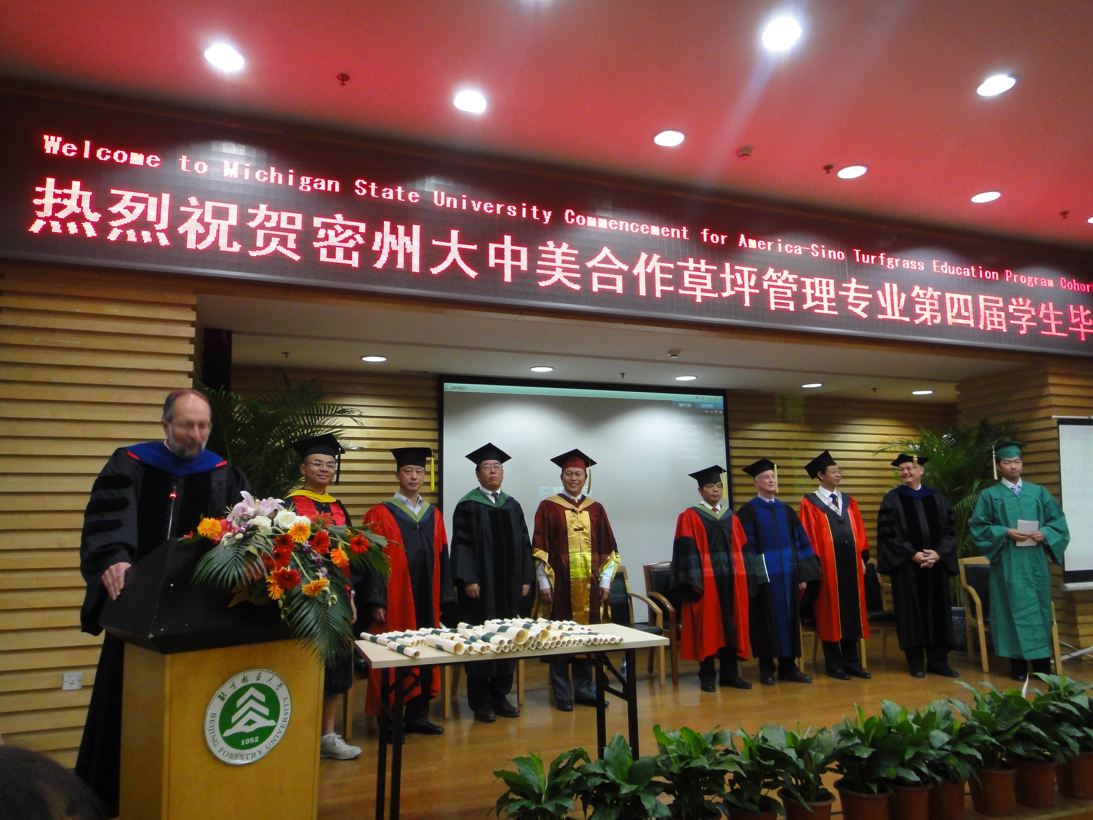 5月14日上午,举行了第四届中美草坪专业毕业典礼。典礼仪式按照密西根州立大学的学位授予仪式举行,由密西根州立大学农业与自然资源学院院长主持,联合办学的五校领导分别致辞祝贺。学校副校长王曙光用英文代表学校对我校的32名毕业生以及其他毕业生和学生家长表示热烈祝贺,同时希望毕业生们在今后的人生中能志存高远,有所成就。王曙光一行还参加了毕业典礼庆祝午餐会。
