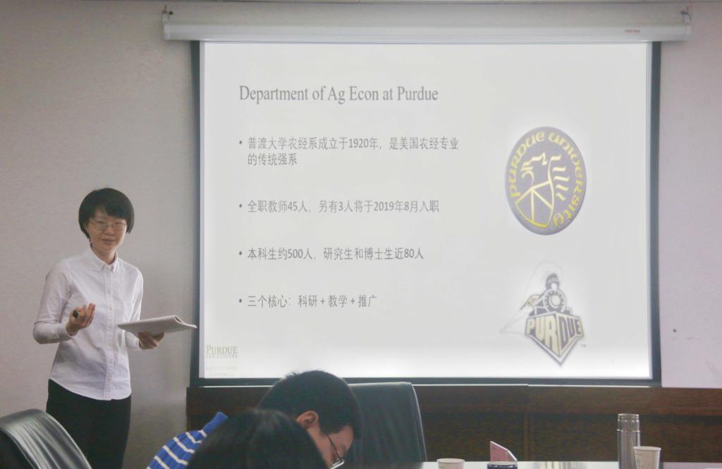 马梅琳首先就美国普渡大学农业经济研究前沿问题作了介绍,分享了自己在参与科研项目、课题研究时的思考,对中美农业产业组织的相关研究进行了对比分析。马梅琳介绍了自己运营管理的农经方面学术论文公众号。学院一名博士研究生表示自己早有关注此公众号,并且里面的推送内容令他受益匪浅。