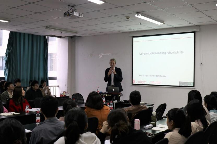 J.Theo M Elzenga教授阐述了当今农业生产中面临干旱、盐碱、极端气温及土壤污染等挑战,在植物适应环境的进程中,植物体内的内生菌类微生物在促进植物生长及适应环境变化中发挥重要作用,具有很高的研发价值。他讲述了所在团队在该领域取得的研究进展,包括发现了一种特殊镰刀菌能有效促进盐碱地中紫羊茅的生物量,筛选出一种抑酸菌能提高植物对低温胁迫的适应性并促进其生长,鉴定了一种能促进植物生长的芽孢杆菌,对小麦、土豆、西红柿等植物都具有正向促进作用。报告内容引起相关师生极大兴趣,报告结束后,师生踊跃提问,讨论热烈而深入,时间持续近2个小时。