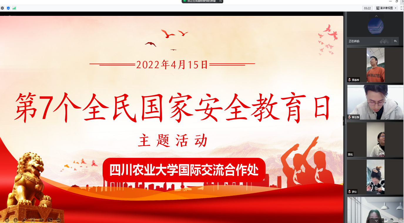 在第7个全民国家安全教育日来临之际,为增强出国留学生的国家安全意识,树牢总体国家安全观,国际交流合作处在线举办了以“维护国家安全,时刻警钟长鸣”为主题的国家安全教育主题活动。国际交流合作处、研究生院部分教师以及全体拟出国留学研究生参会。