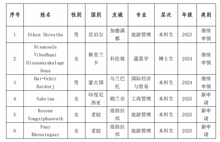 按照《成都市留学生政府奖学金管理办法》相关要求,经个人申请、学校评审推荐,成都市教育局同意我校Diken Shrestha等6名国际学生获得2025年度成都市国际友好城市留学生政府奖学金,现将具体名单公示如下: