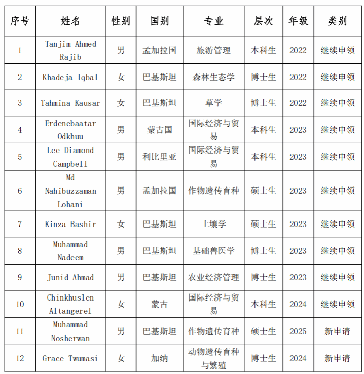 按按照《成都市留学生政府奖学金管理办法》相关要求,经个人申请、学校评审推荐,成都市教育局同意我校Tanjim Ahmed Rajib等12名国际学生获得2025年度成都市“一带一路”留学生政府奖学金,现将具体名单公示如下: